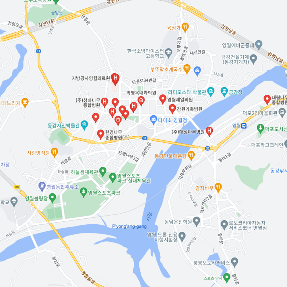 병원과 약국은 해당 지점마다 진료시간과 영업일이 다를 수 있는 만큼 방문 전 반드시 연락해보고 가시는 것을 추천드립니다. 강원 영월군은 영월읍, 상동읍, 산솔면, 김삿갓면, 북면, 남면, 한반도면, 주천면, 무릉도원면으로 구성되어 있습니다.