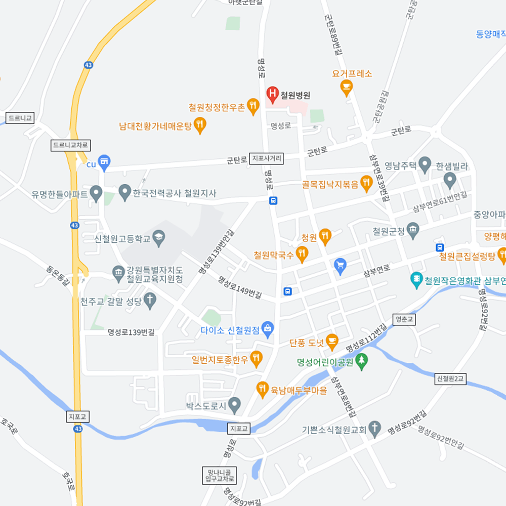병원과 약국은 해당 지점마다 진료시간과 영업일이 다를 수 있는 만큼 방문 전 반드시 연락해보고 가시는 것을 추천드립니다. 강원 철원군은 철원읍, 동송읍, 갈말읍, 김화읍, 서면, 근남면, 근북면, 근동면, 원남면, 원동면, 임남면으로 구성되어 있습니다.