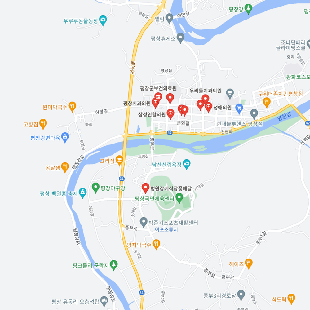 병원과 약국은 해당 지점마다 진료시간과 영업일이 다를 수 있는 만큼 방문 전 반드시 연락해보고 가시는 것을 추천드립니다. 강원 평창군은 평창읍, 미탄면, 방림면, 대화면, 봉평면, 용평면, 진부면, 대관령면으로 구성되어 있습니다.