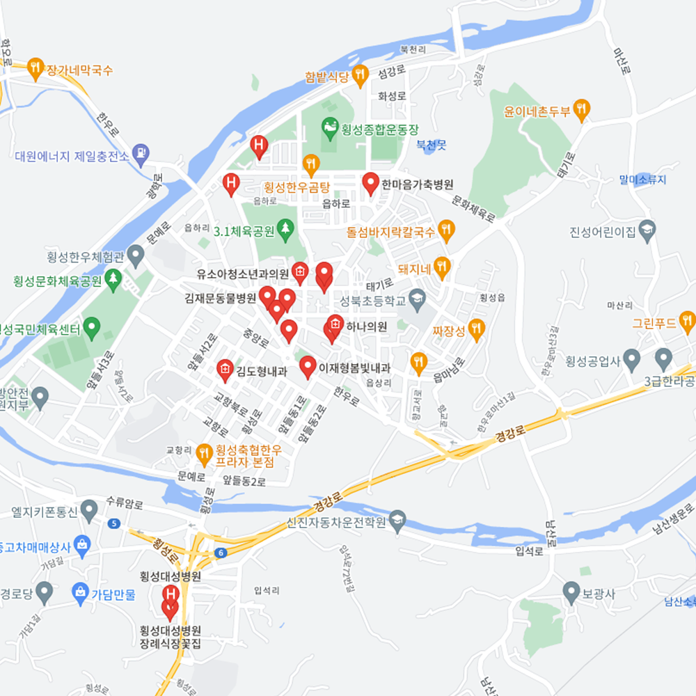 병원과 약국은 해당 지점마다 진료시간과 영업일이 다를 수 있는 만큼 방문 전 반드시 연락해보고 가시는 것을 추천드립니다. 강원 횡성군은 횡성읍, 공근면, 서원면, 우천면, 강림면, 안흥면, 갑천면, 청일면, 둔내면으로 구성되어 있습니다.
