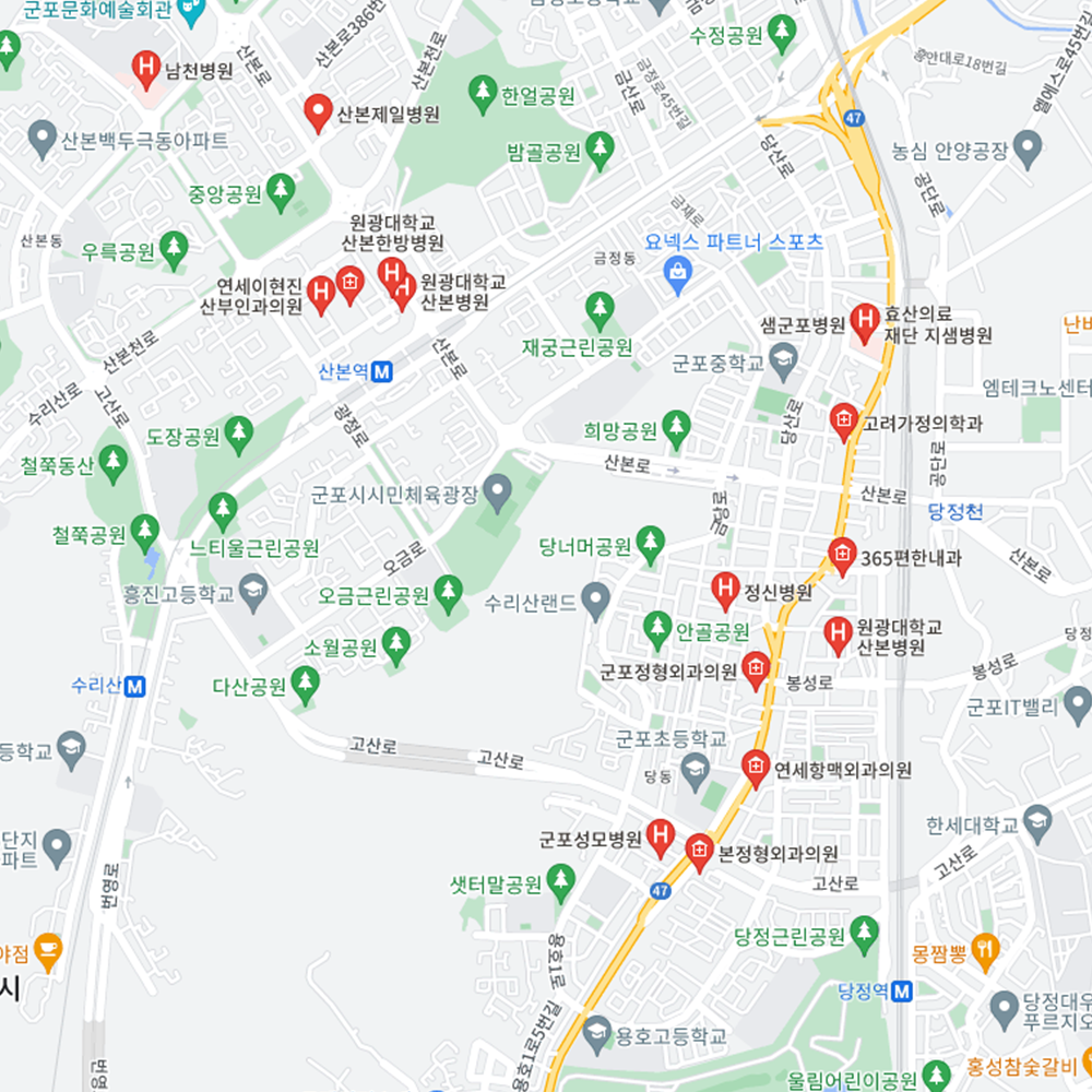 병원과 약국은 해당 지점마다 진료시간과 영업일이 다를 수 있는 만큼 방문 전 반드시 연락해보고 가시는 것을 추천드립니다. 경기 군포시는 군포1동, 군포2동, 산본1동, 산본2동, 수리동, 궁내동, 광정동, 금정동, 재궁동, 오금동, 대야동, 송부동으로 구성되어 있습니다.