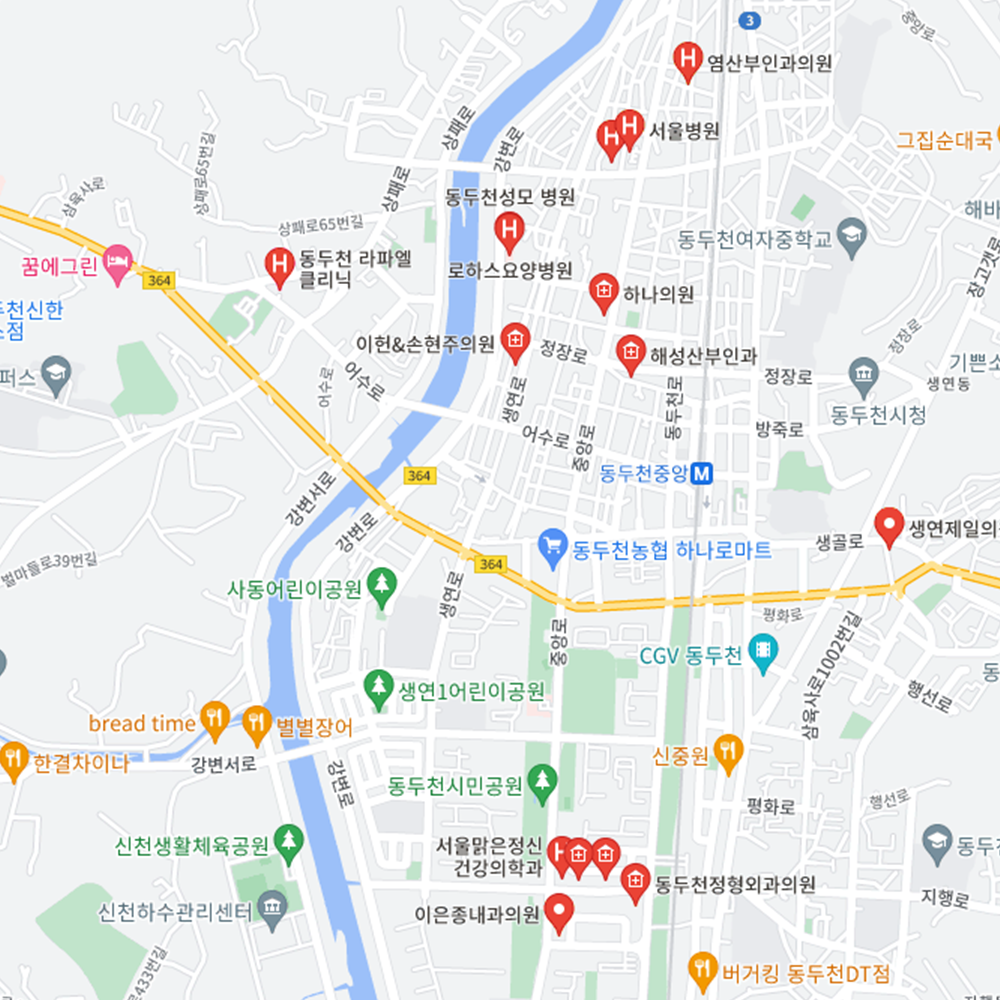병원과 약국은 해당 지점마다 진료시간과 영업일이 다를 수 있는 만큼 방문 전 반드시 연락해보고 가시는 것을 추천드립니다. 경기 동두천시는 생연1동, 생연2동, 중앙동, 불현동, 송내동, 보산동, 소요동, 상패동으로 구성되어 있습니다.