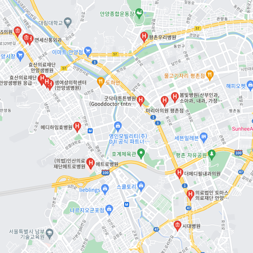 병원과 약국은 해당 지점마다 진료시간과 영업일이 다를 수 있는 만큼 방문 전 반드시 연락해보고 가시는 것을 추천드립니다. 경기 안양시는 만안구(박달1동, 박달2동, 석수1동, 석두2동, 충훈동, 안양1동, 안양2동, 안양3동, 안양4동, 안양5동, 안양6동, 안양7동, 안양8동, 안양9동), 동안구(비산1동, 비산2동, 비산3동, 부흥동, 달안동, 관양동, 인덕원동, 부림동, 평촌동, 평안동, 귀인동, 호계1동, 호계2동 호계3동, 범계동, 신촌동, 갈산동)으로 구성되어 있습니다.
