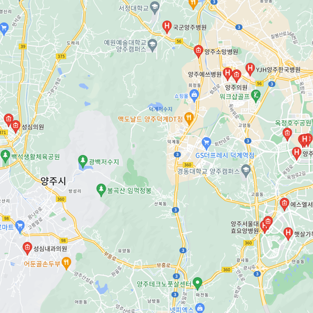 병원과 약국은 해당 지점마다 진료시간과 영업일이 다를 수 있는 만큼 방문 전 반드시 연락해보고 가시는 것을 추천드립니다. 경기 양주시는 양주1동, 양주2동, 회천1동, 회천2동, 회천3동, 옥정1동, 옥정2동, 백석읍, 광적면, 은현면, 장흥면으로 구성되어 있습니다.