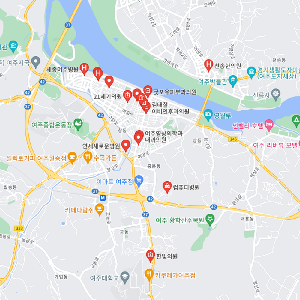병원과 약국은 해당 지점마다 진료시간과 영업일이 다를 수 있는 만큼 방문 전 반드시 연락해보고 가시는 것을 추천드립니다. 경기 여주시는 여흥동, 중앙동, 오학동, 가남읍, 점동면, 흥천면, 금사면, 산북면, 대신면, 북내면, 강천면, 세종대왕면으로 구성되어 있습니다.