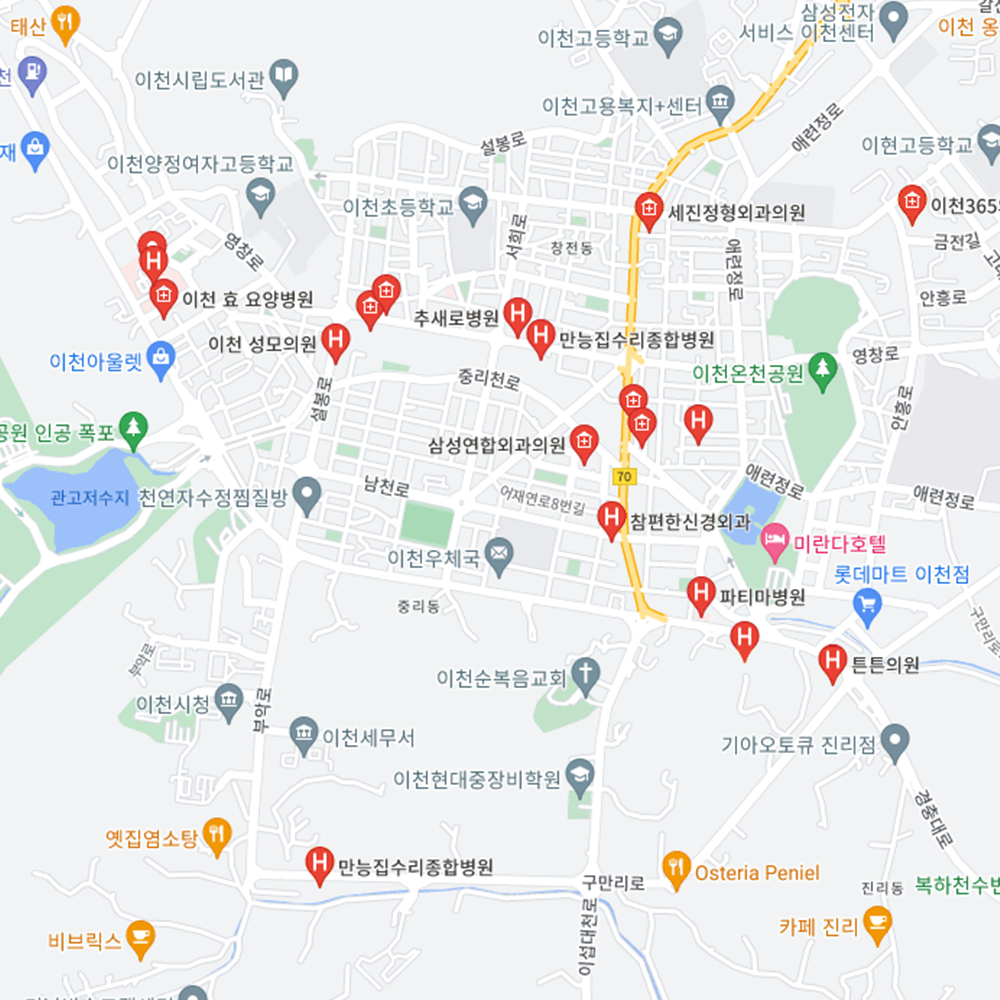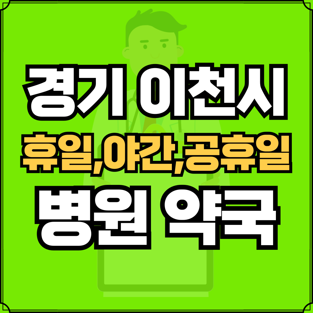 병원과 약국은 해당 지점마다 진료시간과 영업일이 다를 수 있는 만큼 방문 전 반드시 연락해보고 가시는 것을 추천드립니다. 경기 이천시는 관고동, 중리동, 증포동, 창천동, 부발읍, 장호원읍, 대월면, 마장면, 모가면, 백사면, 설성면, 신둔면, 율면, 호법면으로 구성되어 있습니다.