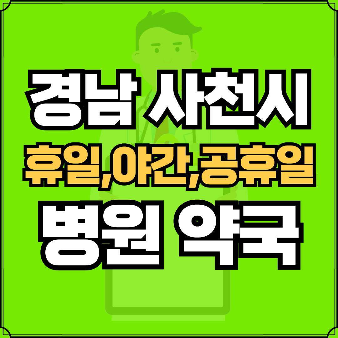 병원과 약국은 해당 지점마다 진료시간과 영업일이 다를 수 있는 만큼 방문 전 반드시 연락해보고 가시는 것을 추천드립니다. 경남 사천시는 남양동, 동서동, 동서금동, 벌용동, 선구동, 향촌동, 사천읍, 곤명면, 곤양면, 사남면, 서포면, 용현면, 정동면, 축동면으로 구성되어 있습니다.