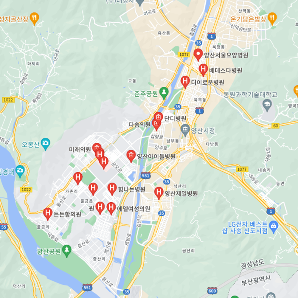 병원과 약국은 해당 지점마다 진료시간과 영업일이 다를 수 있는 만큼 방문 전 반드시 연락해보고 가시는 것을 추천드립니다. 경남 양산시는 강서동, 삼성동, 양주동, 중앙동, 덕계동, 서창동, 소주동, 평산동, 물금읍, 동면, 상북면, 원동면, 하북면으로 구성되어 있습니다.