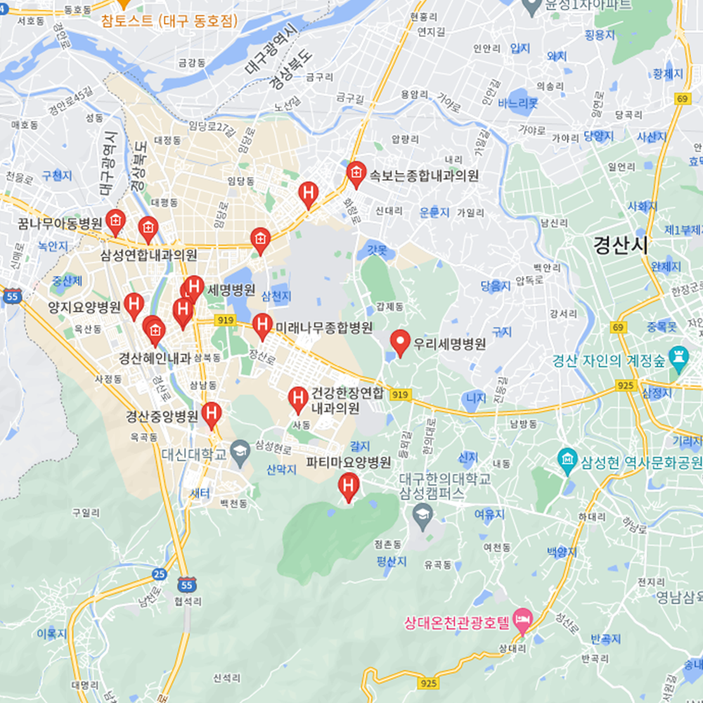 병원과 약국은 해당 지점마다 진료시간과 영업일이 다를 수 있는 만큼 방문 전 반드시 연락해보고 가시는 것을 추천드립니다. 경북 경산시는 남부동, 동부동, 북부동, 서부1동, 서부2동, 중방동, 중앙동, 압량읍, 진량읍, 하양읍, 남산면, 남천면, 용성면, 와촌면, 자인면으로 구성되어 있습니다.