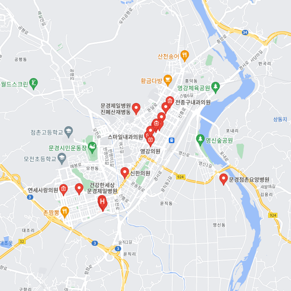 병원과 약국은 해당 지점마다 진료시간과 영업일이 다를 수 있는 만큼 방문 전 반드시 연락해보고 가시는 것을 추천드립니다. 경북 문경시는 점촌1동, 점촌2동, 점촌3동, 점촌4동, 점촌5동, 가은읍, 문경읍, 농암면, 동로면, 마성면, 산북면, 산양면, 영순면, 호계면으로 구성되어 있습니다.