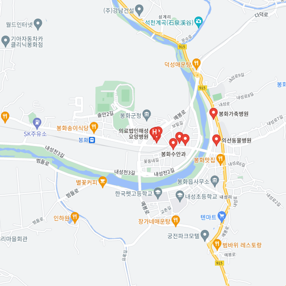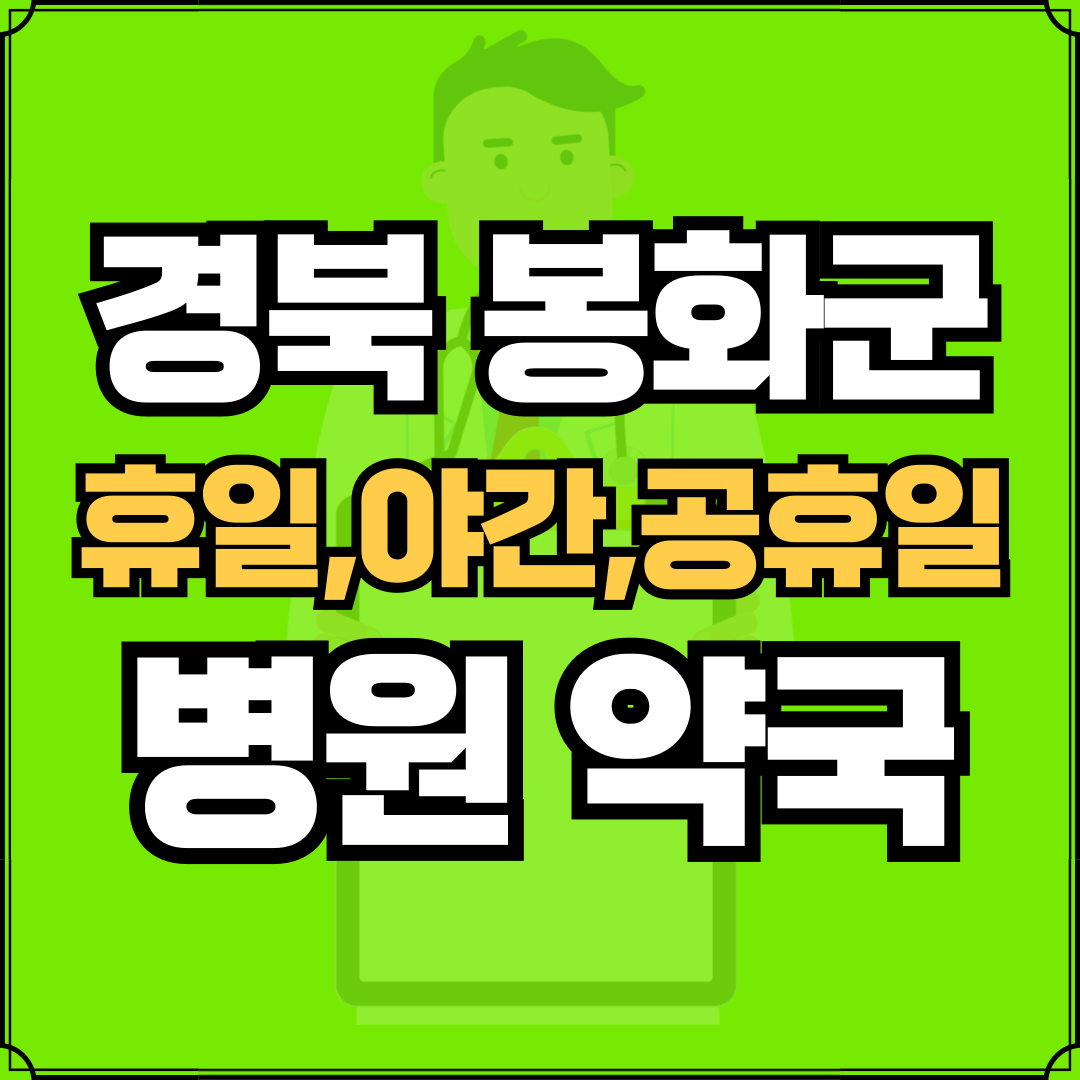 병원과 약국은 해당 지점마다 진료시간과 영업일이 다를 수 있는 만큼 방문 전 반드시 연락해보고 가시는 것을 추천드립니다. 경북 봉화군은 봉화읍, 봉성면, 명호면, 상운면, 춘양면, 소천면, 재산면, 법전면, 석포면, 물야면으로 구성되어 있습니다.