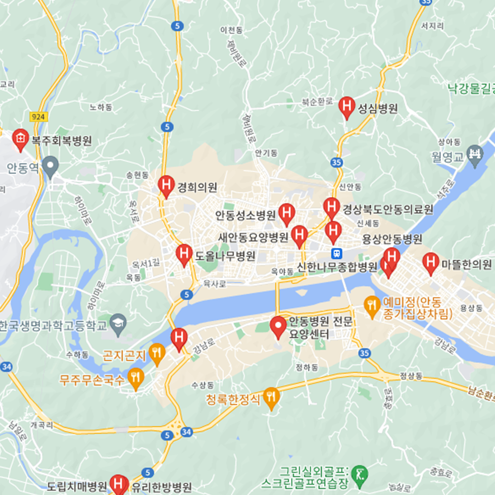 병원과 약국은 해당 지점마다 진료시간과 영업일이 다를 수 있는 만큼 방문 전 반드시 연락해보고 가시는 것을 추천드립니다. 경북 안동시는 강남동, 명륜동, 서구동, 송하동, 안기동, 옥동, 용상동, 중구동, 태화동, 평화동, 풍산읍, 풍천면, 와룡면, 남선면, 남후면, 일직면, 서후면, 북후면, 길안면, 임동면, 임하면, 예안면, 도산면, 녹전면으로 구성되어 있습니다.