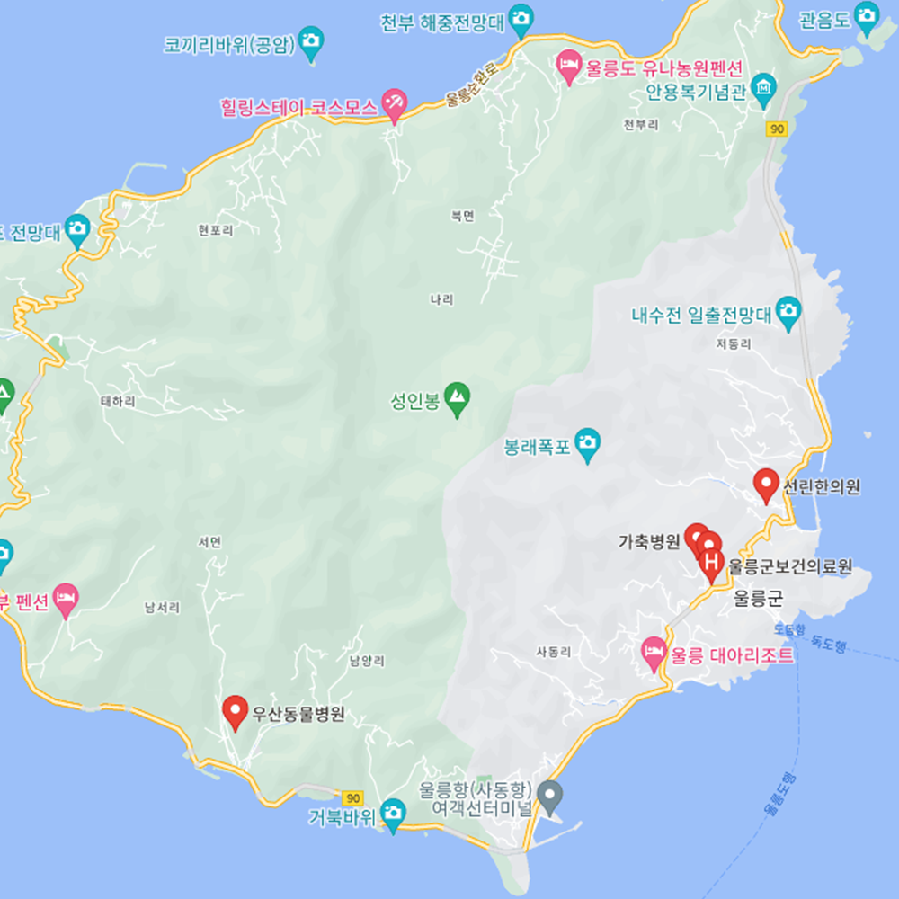 병원과 약국은 해당 지점마다 진료시간과 영업일이 다를 수 있는 만큼 방문 전 반드시 연락해보고 가시는 것을 추천드립니다. 경북 울릉군은 울릉읍, 도동리, 독도리, 사동리, 저동리, 북면, 나리, 천부리, 현포리, 서면, 남서리, 남양리, 태하리로 구성되어 있습니다.