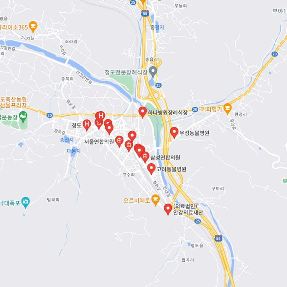 병원과 약국은 해당 지점마다 진료시간과 영업일이 다를 수 있는 만큼 방문 전 반드시 연락해보고 가시는 것을 추천드립니다. 경북 청도군은 청도읍, 화양읍, 각남면, 각북면, 이서면, 풍각면, 금천면, 매전면, 운문면으로 구성되어 있습니다.