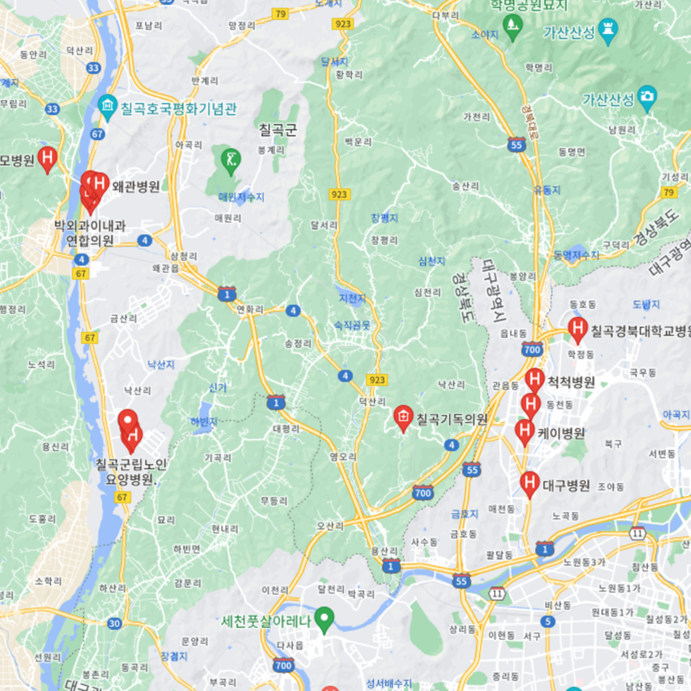 병원과 약국은 해당 지점마다 진료시간과 영업일이 다를 수 있는 만큼 방문 전 반드시 연락해보고 가시는 것을 추천드립니다. 경북 칠곡군은 왜관읍, 북삼읍, 석적읍, 가산면, 기산면, 동명면, 양목면, 지천면으로 구성되어 있습니다.