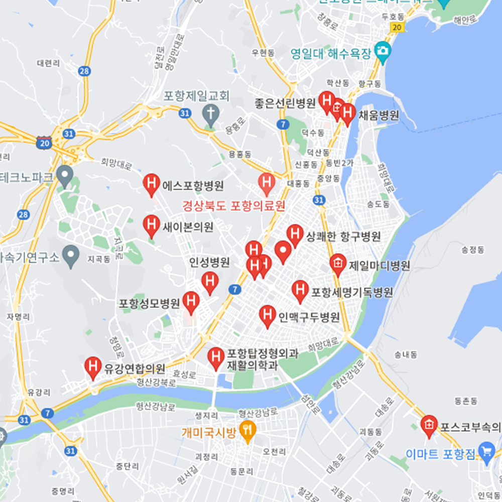 병원과 약국은 해당 지점마다 진료시간과 영업일이 다를 수 있는 만큼 방문 전 반드시 연락해보고 가시는 것을 추천드립니다. 경북 포항시 남구는 상대동, 해도동, 송도동, 청림동, 제철동, 효곡동, 대이동, 구룡포읍, 연일읍, 오천읍, 대송면, 동해면, 장기면, 호미곶면으로 구성되어 있습니다.