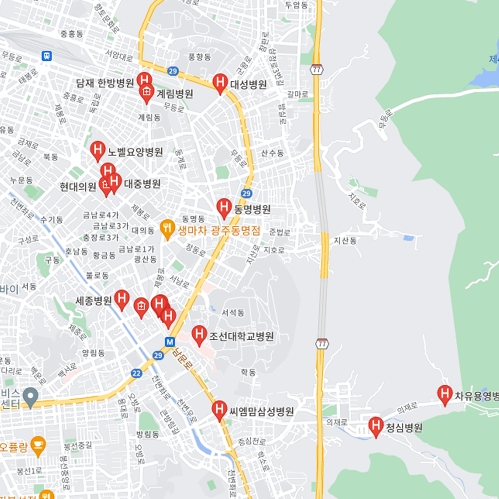 병원과 약국은 해당 지점마다 진료시간과 영업일이 다를 수 있는 만큼 방문 전 반드시 연락해보고 가시는 것을 추천드립니다. 광주 동구는 충장동, 동명동, 계림1동, 계림2동, 산수1동, 산수2동, 지산1동, 지산2동, 서남동, 학동, 학운동, 지원1동, 지원2동으로 구성되어 있습니다.