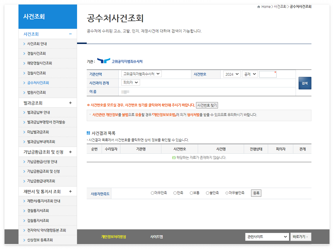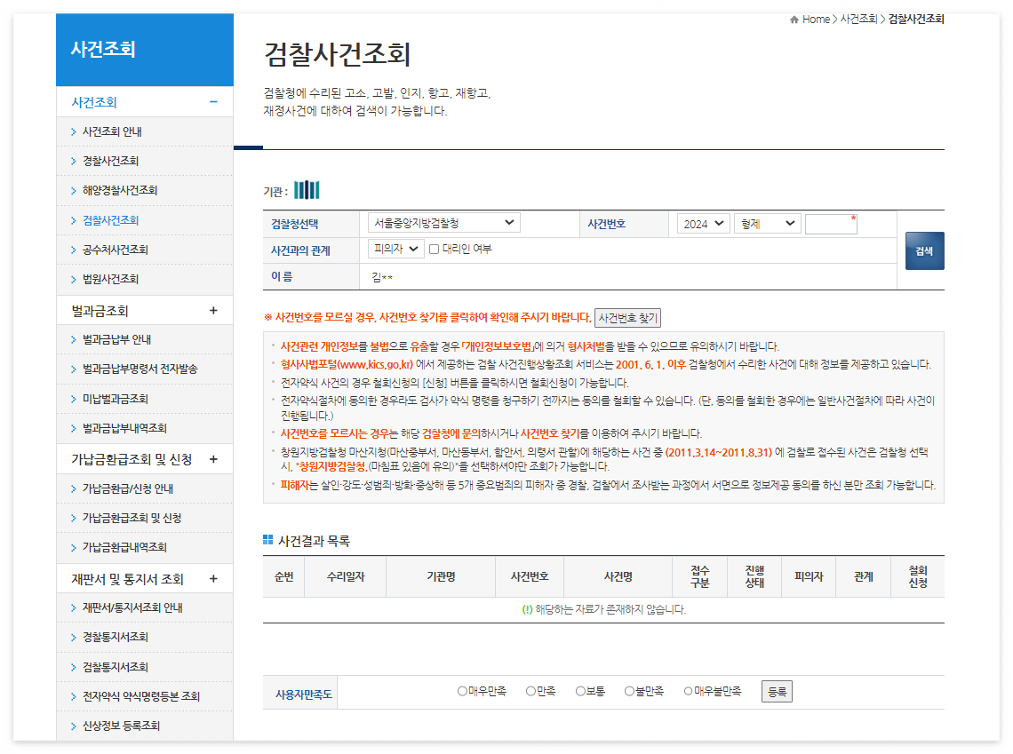 아래는 각 수사기관별 사건조회 화면입니다. 참고하셔서 이용하시면 되겠습니다.
