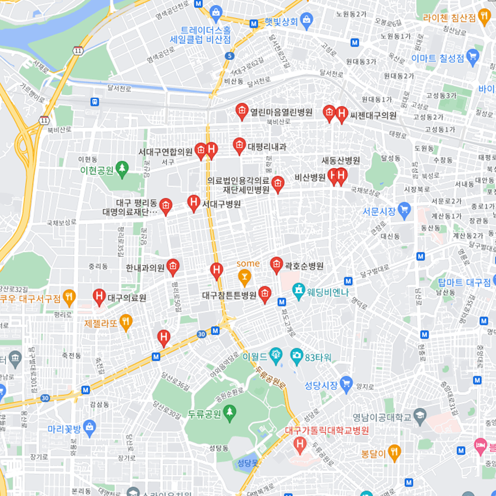 병원과 약국은 해당 지점마다 진료시간과 영업일이 다를 수 있는 만큼 방문 전 반드시 연락해보고 가시는 것을 추천드립니다. 대구 서구는 내당1동, 내당2동, 내당3동, 내동4동, 비산1동, 비산2동, 비산3동, 비산4동, 비산5동, 비산6동, 비산7동, 평리1동, 평리2동, 평리3동, 평리4동, 평리5동, 평리6동, 상중이동, 원대동으로 구성되어 있습니다.