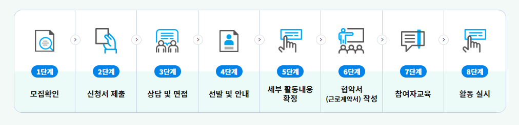 - 근무내용 : 교육시설 학습보조, 시니어 컨설턴트, 취약계층 공익증진 서비스, 노인맞춤돌봄 서비스 등