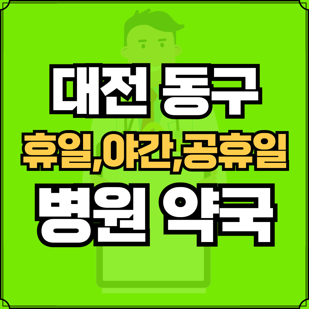 병원과 약국은 해당 지점마다 진료시간과 영업일이 다를 수 있는 만큼 방문 전 반드시 연락해보고 가시는 것을 추천드립니다. 대전 동구는 중앙동, 신인동, 효동, 판암1동, 판암2동, 대동, 용운동, 자양동, 가양1동, 가양2동, 용전동, 성남동, 홍도동, 삼성동, 대청동, 산내동으로 구성되어 있습니다.