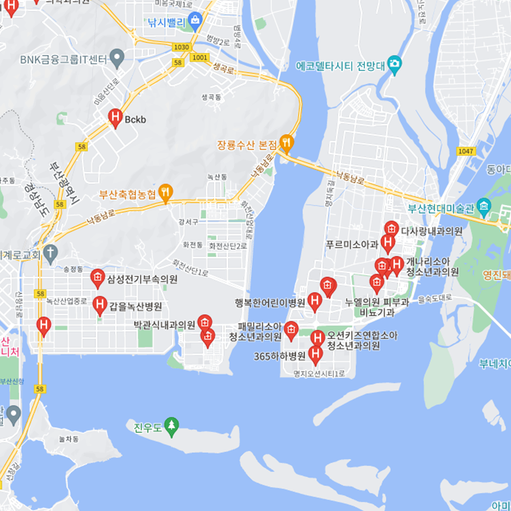 병원과 약국은 해당 지점마다 진료시간과 영업일이 다를 수 있는 만큼 방문 전 반드시 연락해보고 가시는 것을 추천드립니다. 부산 강서구는 대저1동, 대저2동, 강동동, 명지1동, 명지2동, 가락동, 녹산동, 가덕도동으로 구성되어 있습니다.