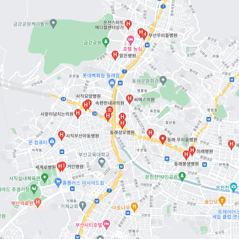병원과 약국은 해당 지점마다 진료시간과 영업일이 다를 수 있는 만큼 방문 전 반드시 연락해보고 가시는 것을 추천드립니다. 부산 동래구는 명륜동, 명장1동, 명장2동, 복산동, 사직1동, 사직2동, 사직3동, 수민동, 안락1동, 안락2동, 온천1동, 온천2동, 온천3동으로 구성되어 있습니다.