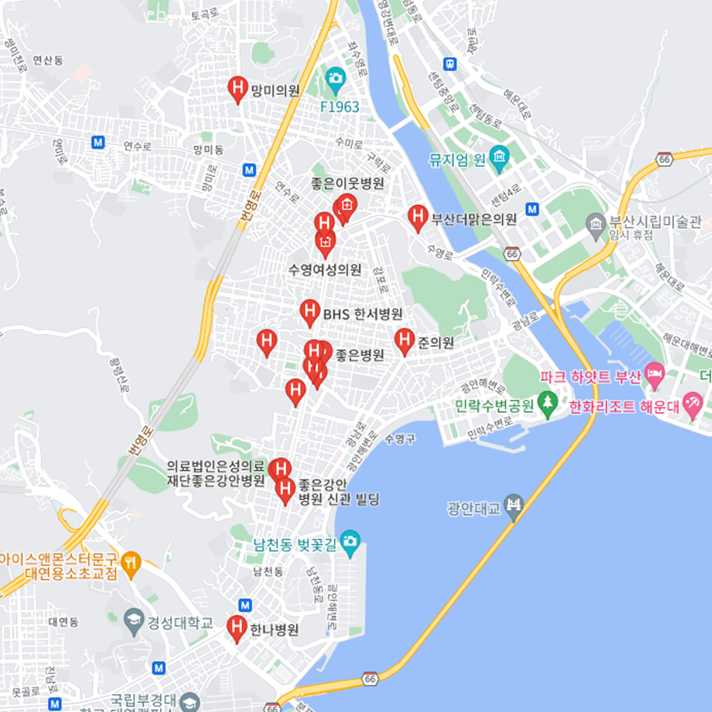 - 수영구 : 좋은강안병원, BHS한서병원, 센텀종합병원