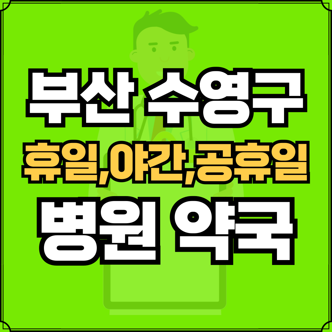 병원과 약국은 해당 지점마다 진료시간과 영업일이 다를 수 있는 만큼 방문 전 반드시 연락해보고 가시는 것을 추천드립니다. 부산 수영구는 남천1동, 남천2동, 수영동, 망미1동, 망미2동, 광안1동, 광안2동, 광안3동, 광안4동, 민락동으로 구성되어 있습니다.