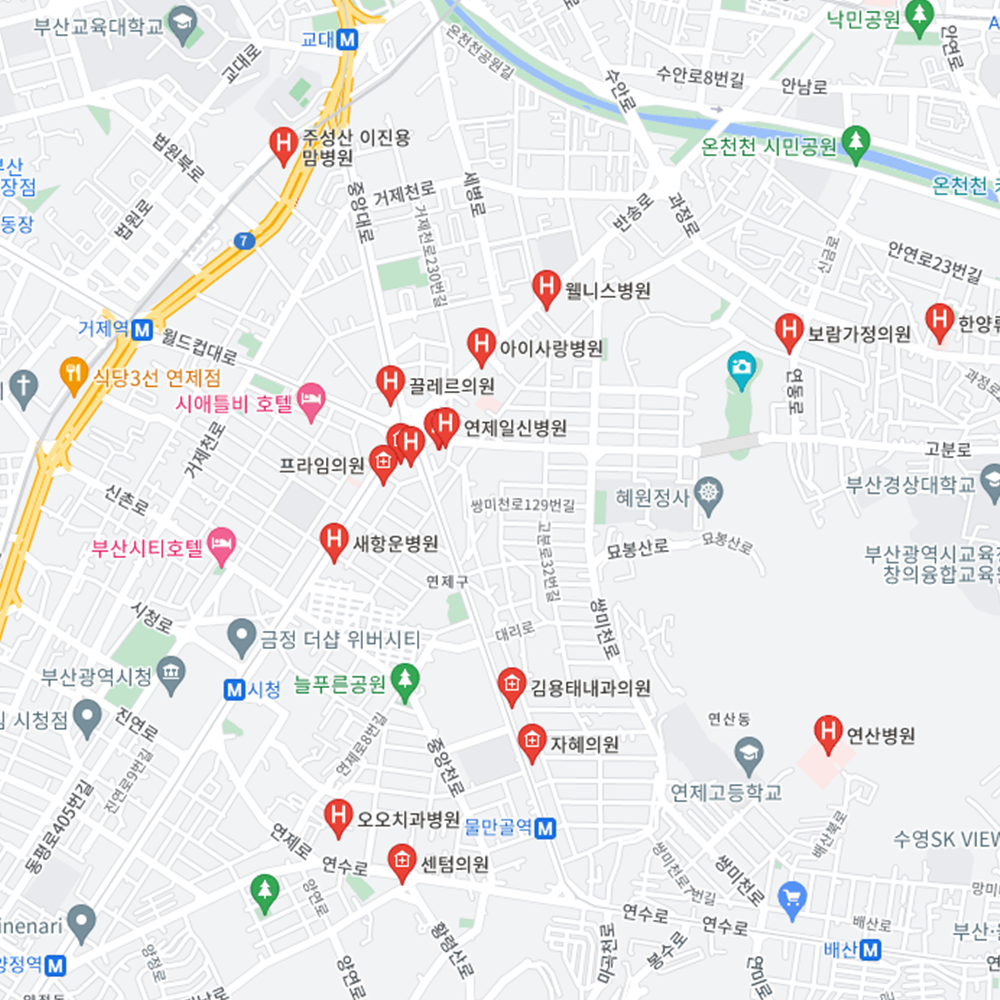 병원과 약국은 해당 지점마다 진료시간과 영업일이 다를 수 있는 만큼 방문 전 반드시 연락해보고 가시는 것을 추천드립니다. 부산 연제구는 거제동, 연산동으로 구성되어 있습니다.