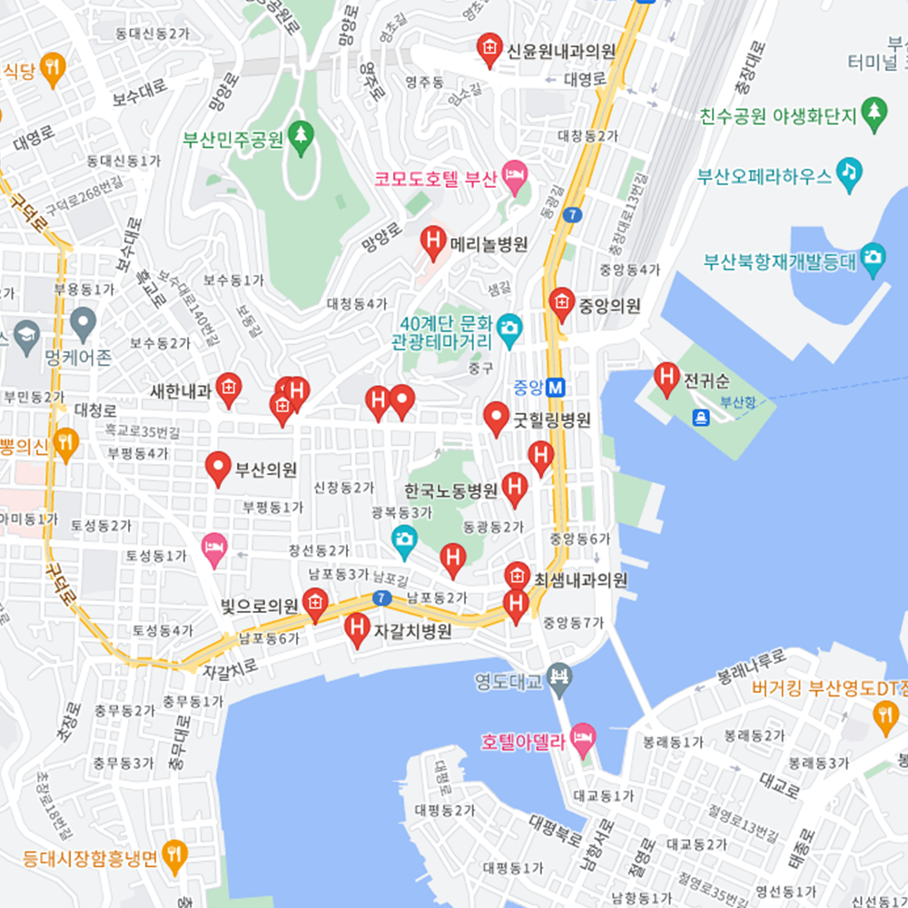 병원과 약국은 해당 지점마다 진료시간과 영업일이 다를 수 있는 만큼 방문 전 반드시 연락해보고 가시는 것을 추천드립니다. 부산시 중구는 중앙동, 동광동, 대청동, 보수동, 부평동, 광복동, 남포동, 영주1동, 영주2동으로 구성되어 있습니다.
