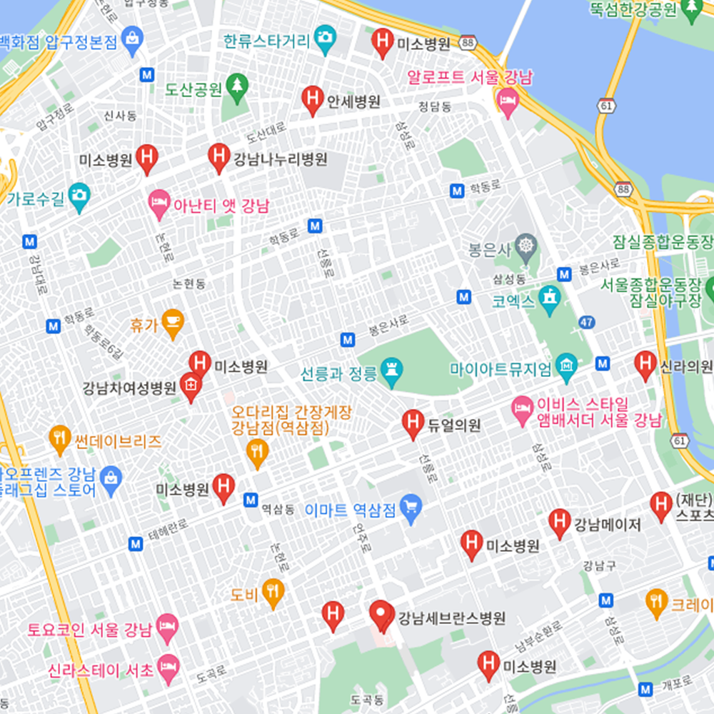 병원과 약국은 해당 지점마다 진료시간과 영업일이 다를 수 있는 만큼 방문 전 반드시 연락해보고 가시는 것을 추천드립니다. 서울 강남구는 신사동, 압구정동, 논현1동, 논현2동, 청담동, 삼성1동, 삼성2동, 대치1동, 대치2동, 대치4동, 역삼1동, 역삼2동, 도곡1동, 도곡2동, 개포1동, 개포2동, 개포3동, 개포4동, 일원본동, 일원1동, 수서동, 세곡동으로 구성되어 있습니다.