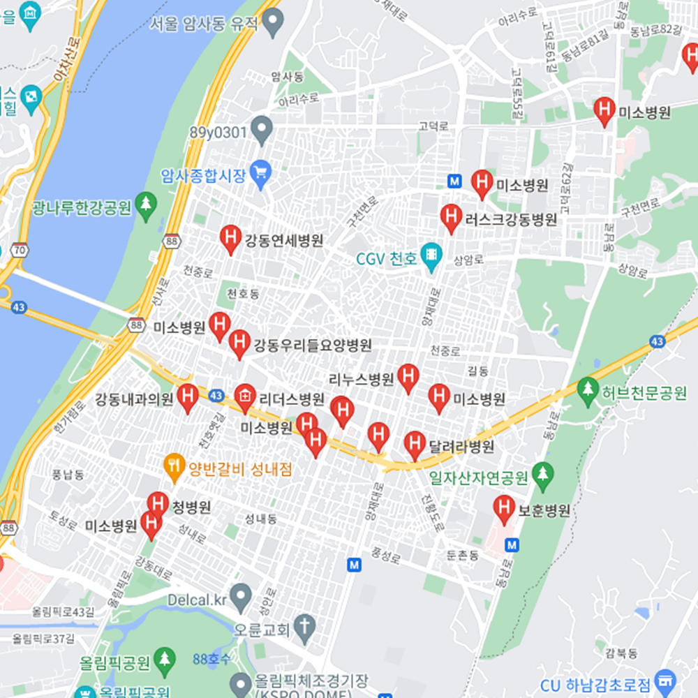 병원과 약국은 해당 지점마다 진료시간과 영업일이 다를 수 있는 만큼 방문 전 반드시 연락해보고 가시는 것을 추천드립니다. 서울 강동구는 강일동, 상일1동, 상일2동, 고덕1동, 고덕2동, 명일1동, 명일2동, 암사1동, 암사2동, 암사3동, 천호1동, 천호2동, 천호3동, 성내1동, 성내2동, 성내3동, 길동, 둔촌1동, 둔촌2동으로 구성되어 있습니다.