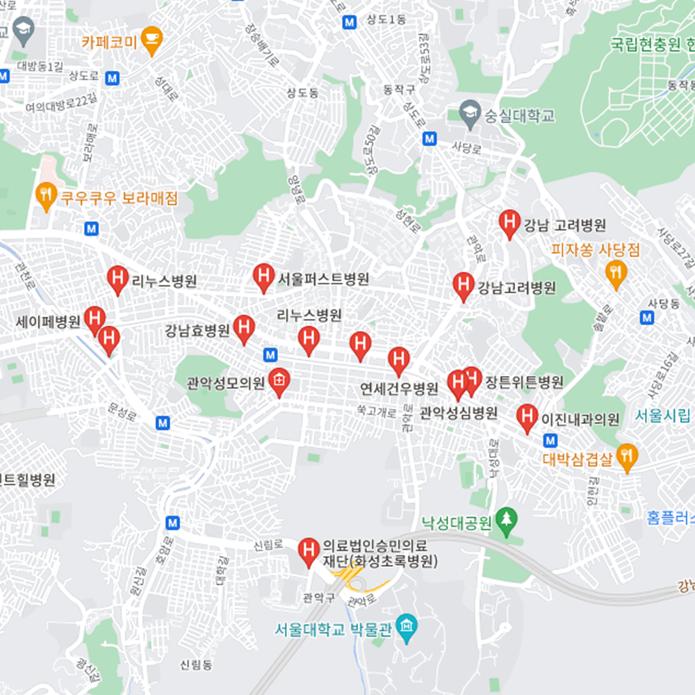 병원과 약국은 해당 지점마다 진료시간과 영업일이 다를 수 있는 만큼 방문 전 반드시 연락해보고 가시는 것을 추천드립니다. 서울 관악구는 봉천동, 신림동, 남현동으로 구성되어 있습니다.