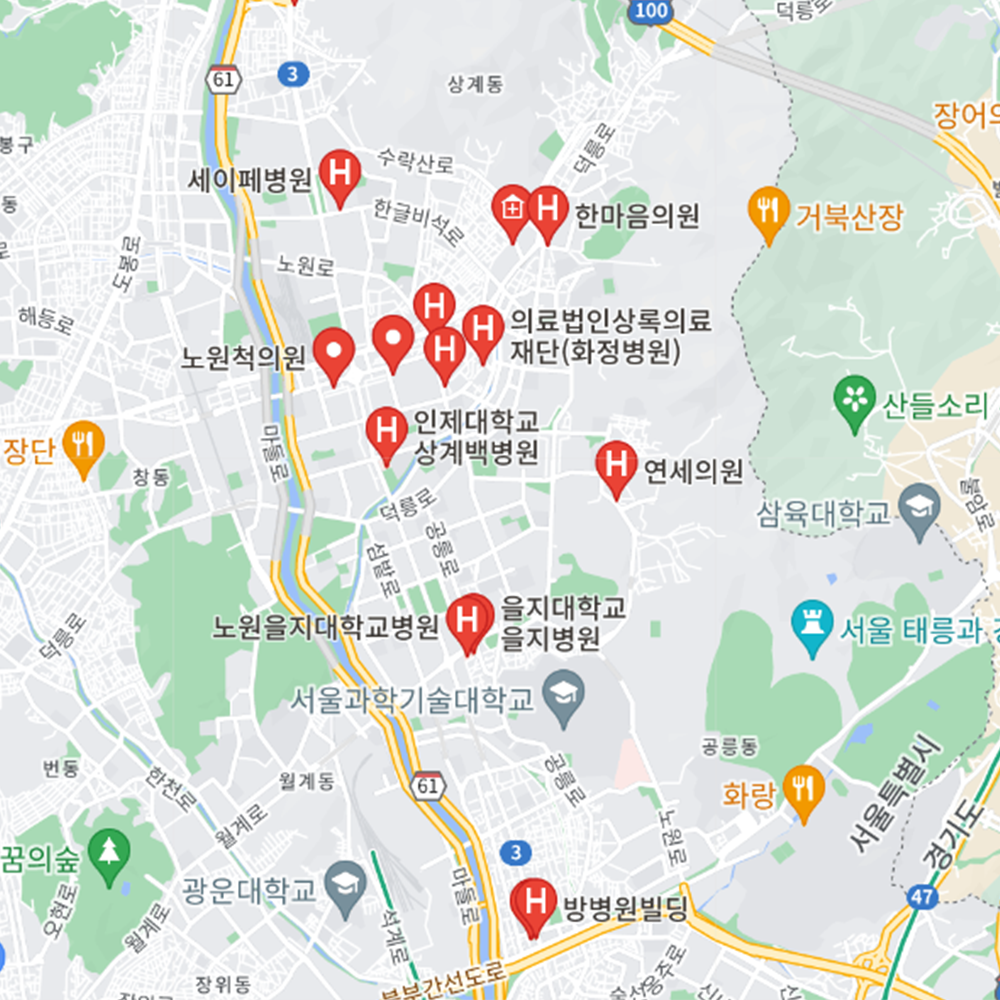 - 노원구 : 노원을지대학교병원, 인제대학교 상계백병원, 한국원자력의학원 원자력병원