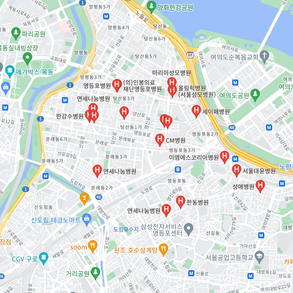 병원과 약국은 해당 지점마다 진료시간과 영업일이 다를 수 있는 만큼 방문 전 반드시 연락해보고 가시는 것을 추천드립니다. 서울 영등포구는 여의동, 영등포동, 영등포본동, 당산1동, 당산2동, 도림동, 문래동, 신길1동, 신길3동, 신길4동, 신길5동, 신길6동, 신길7동, 대림1동, 대림2동, 대림3동, 양평1동, 양평2동으로 구성되어 있습니다.