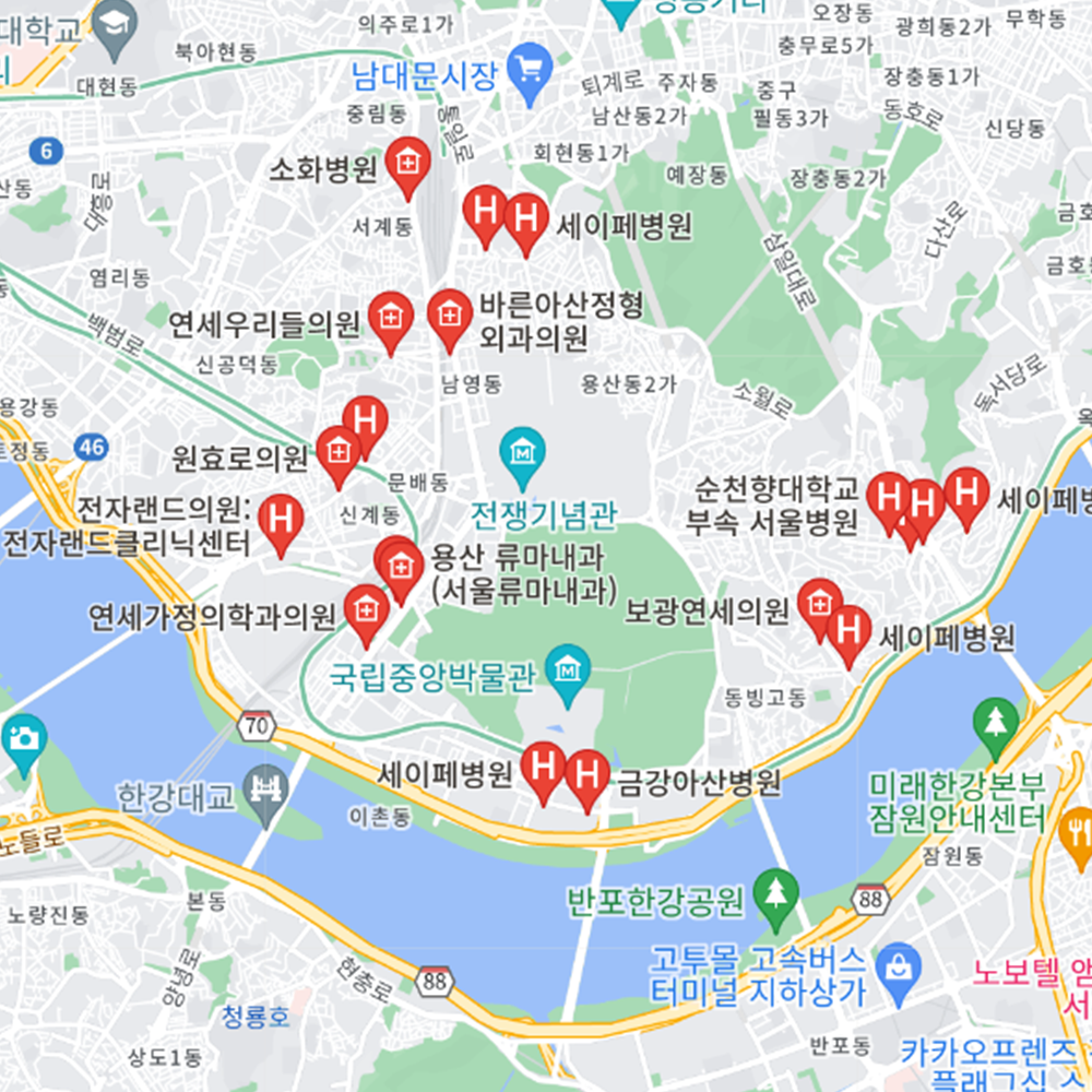 병원과 약국은 해당 지점마다 진료시간과 영업일이 다를 수 있는 만큼 방문 전 반드시 연락해보고 가시는 것을 추천드립니다. 서울 용산구는 후암동, 용산2가동, 남영동, 청파동, 원효로1동, 원효로2동, 효창동, 용문동, 한강로동, 이촌1동, 이촌2동, 이태원1동, 이태원2동, 한남동, 서빙고동, 보광동으로 구성되어 있습니다.