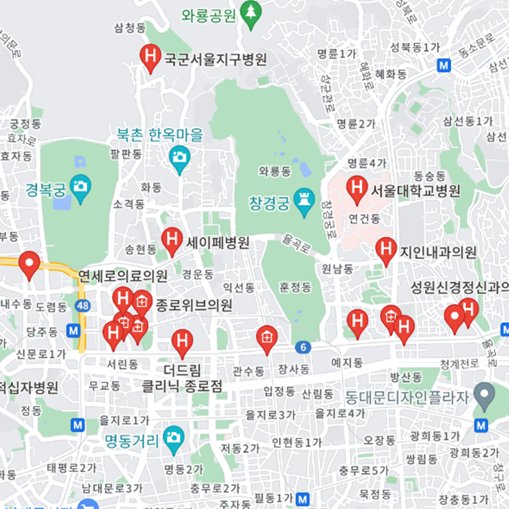 병원과 약국은 해당 지점마다 진료시간과 영업일이 다를 수 있는 만큼 방문 전 반드시 연락해보고 가시는 것을 추천드립니다. 서울 종로구는 가회동, 사직동, 삼청동, 이화동, 종로1가동, 종로2가동, 종로3가동, 종로4가동, 종로5가동, 종로6가동, 청운효자동, 혜화동, 무악동, 부암동, 평창동, 교남동, 숭인1동, 숭인2동, 창신1동, 창신2동, 창신3동으로 구성되어 있습니다.