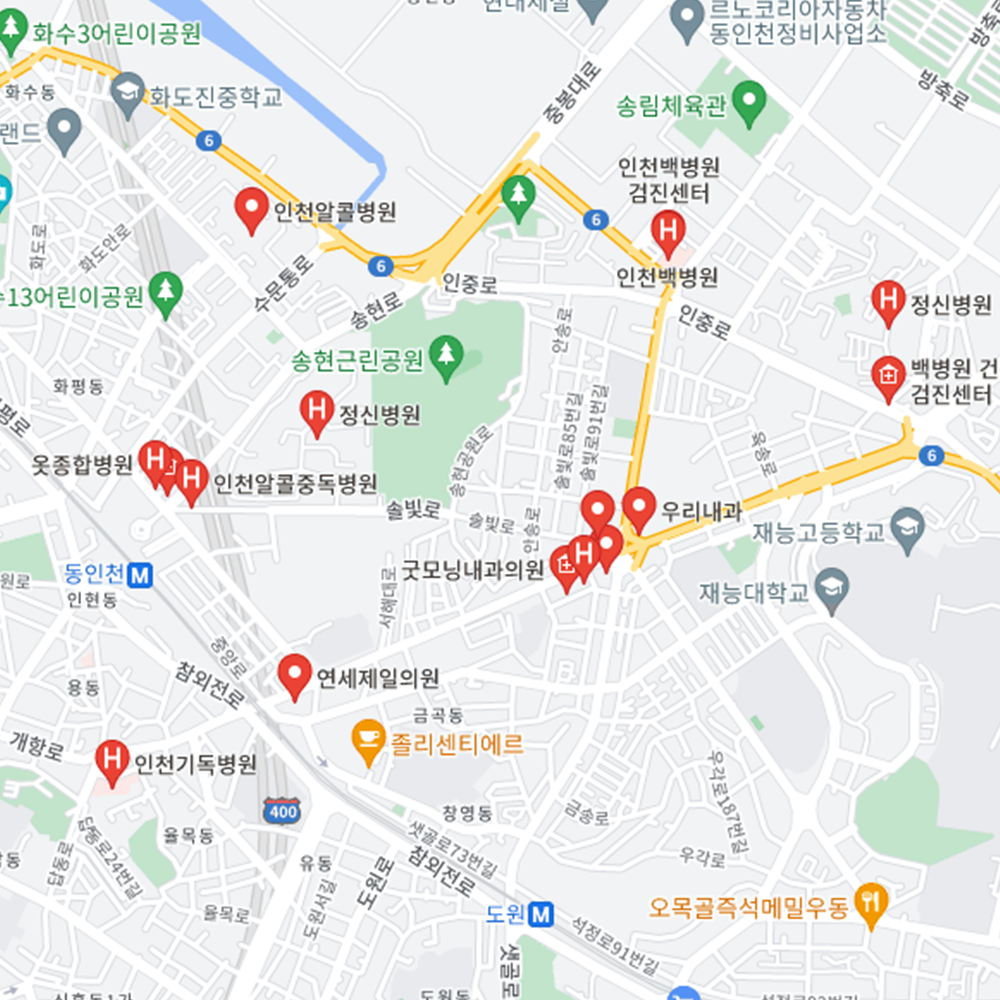 병원과 약국은 해당 지점마다 진료시간과 영업일이 다를 수 있는 만큼 방문 전 반드시 연락해보고 가시는 것을 추천드립니다. 인천 동구는 만석동, 화수1동, 화평동, 화수2동, 송현1동, 송현2동, 송현3동, 송림1동, 송림2동, 송림3동, 송림4동, 송림5동, 송림6동, 금창동으로 구성되어 있습니다.