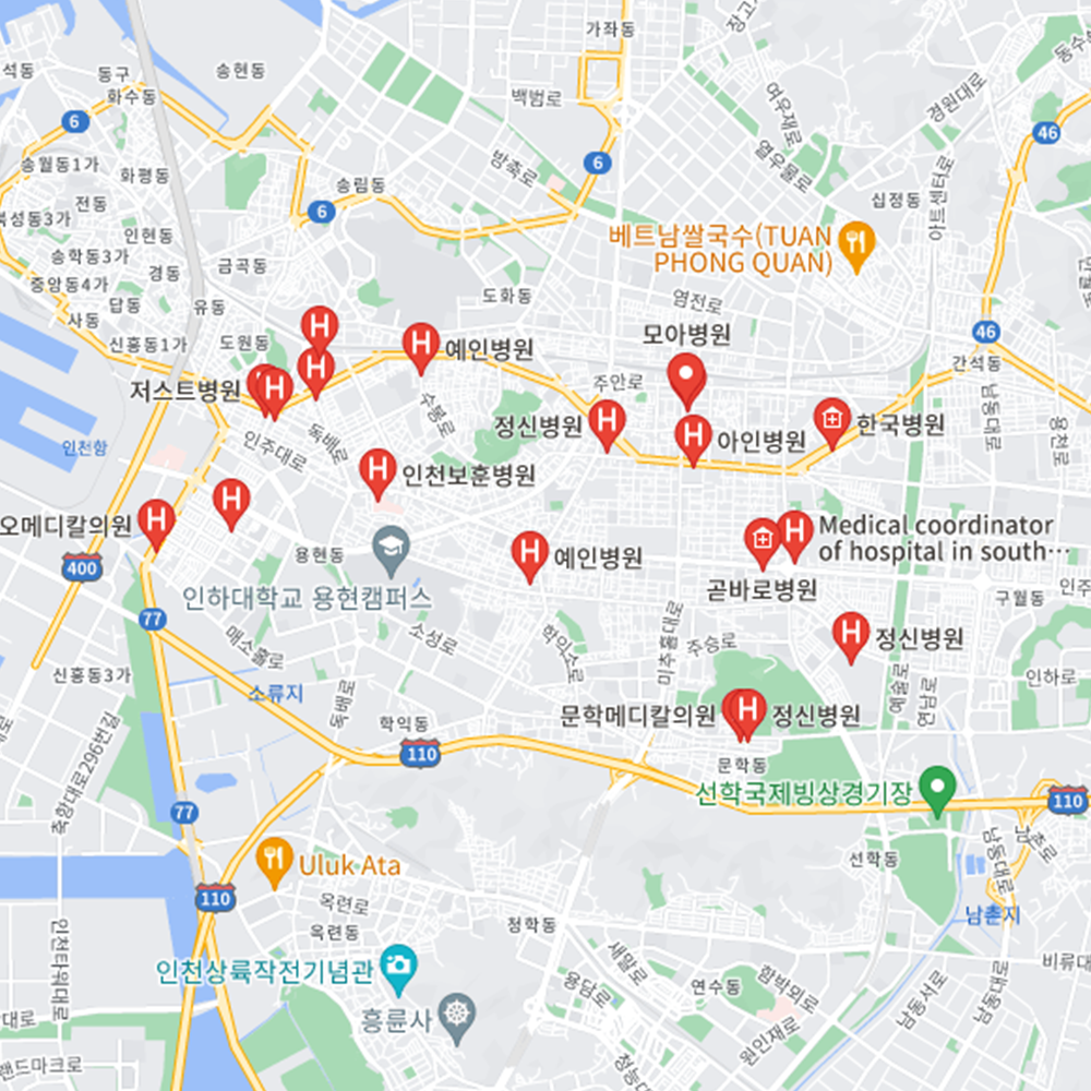 병원과 약국은 해당 지점마다 진료시간과 영업일이 다를 수 있는 만큼 방문 전 반드시 연락해보고 가시는 것을 추천드립니다. 인천 미추홀구는 숭의1동, 숭의2동, 숭의3동, 숭의4동, 용현1동, 용현2동, 용현3동, 용현4동, 용현5동, 도화1동, 도화2동, 도화3동, 주안1동, 주안2동, 주안3동, 주안4동, 주안5동, 주안6동, 주안7동, 주안8동, 학익1동, 학익2동, 관교동, 문학동으로 구성되어 있습니다.