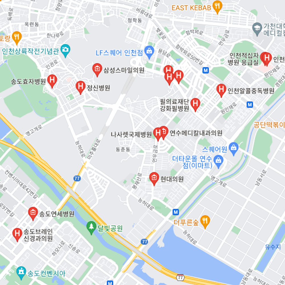 병원과 약국은 해당 지점마다 진료시간과 영업일이 다를 수 있는 만큼 방문 전 반드시 연락해보고 가시는 것을 추천드립니다. 인천 연수구는 옥련1동, 옥련2동, 연수1동, 연수2동, 연수3동, 동춘1동, 동춘2동, 동춘3동, 선학동, 청학동, 송도1동, 송도2동, 송도3동, 송도4동, 송도5동으로 구성되어 있습니다.