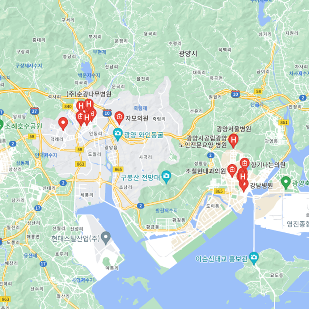 병원과 약국은 해당 지점마다 진료시간과 영업일이 다를 수 있는 만큼 방문 전 반드시 연락해보고 가시는 것을 추천드립니다. 전남 광양시는 골약동, 광영동, 금호동, 중마동, 태인동, 광양읍, 다압면, 봉강면, 옥곡면, 옥룡면, 진상면, 진월면으로 구성되어 있습니다.