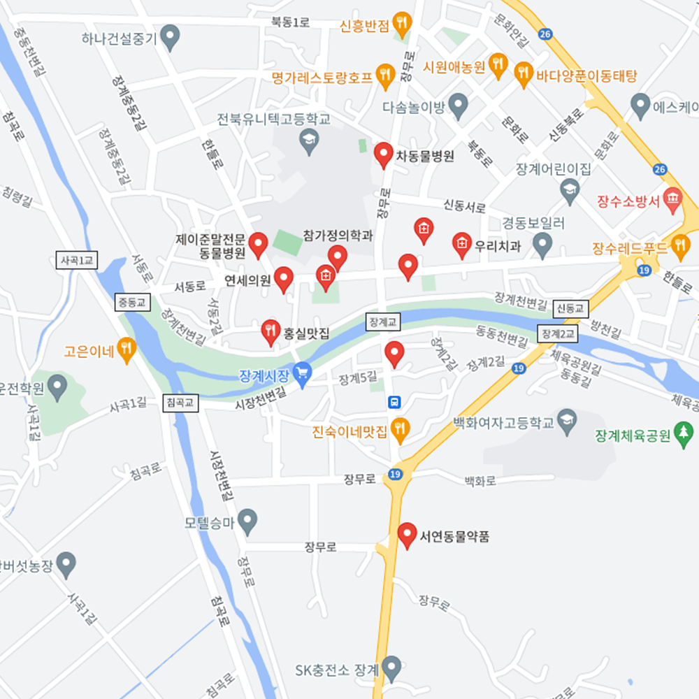 병원과 약국은 해당 지점마다 진료시간과 영업일이 다를 수 있는 만큼 방문 전 반드시 연락해보고 가시는 것을 추천드립니다. 전북 장수군은 장수읍, 계남면, 계북면, 번암면, 산서면, 장계면, 천천면으로 구성되어 있습니다.