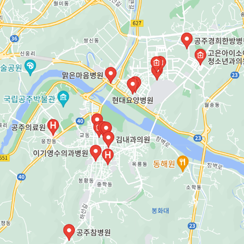 병원과 약국은 해당 지점마다 진료시간과 영업일이 다를 수 있는 만큼 방문 전 반드시 연락해보고 가시는 것을 추천드립니다. 충남 공주시는 금학동, 신관동, 옥룡동, 웅진동, 월송동, 중학동, 유구읍, 계룡면, 반포면, 사곡면, 신풍면, 우성면, 의당면, 이인면, 정안면, 탄천면으로 구성되어 있습니다.