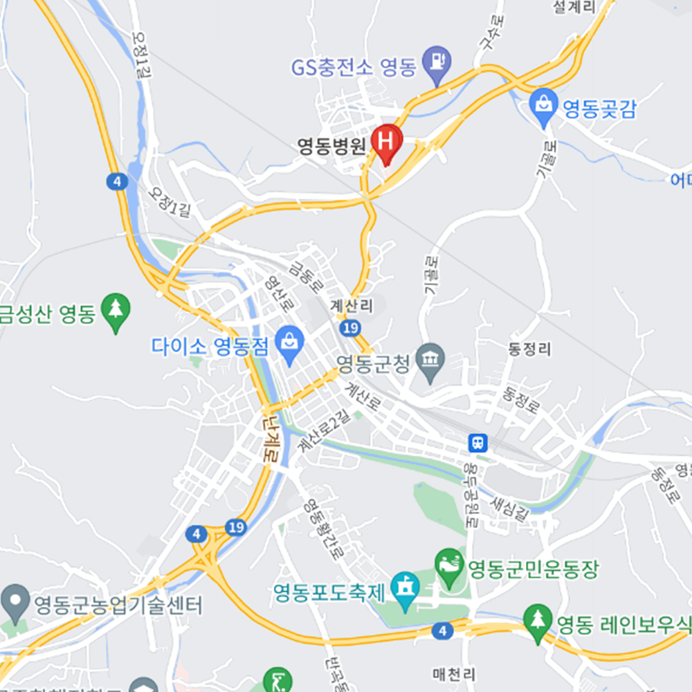 병원과 약국은 해당 지점마다 진료시간과 영업일이 다를 수 있는 만큼 방문 전 반드시 연락해보고 가시는 것을 추천드립니다. 충북 영동군은 영동읍, 매곡면, 상촌면, 심천면, 양강면, 양산면, 용산면, 용화면, 추풍령면, 학산면, 황간면으로 구성되어 있습니다.