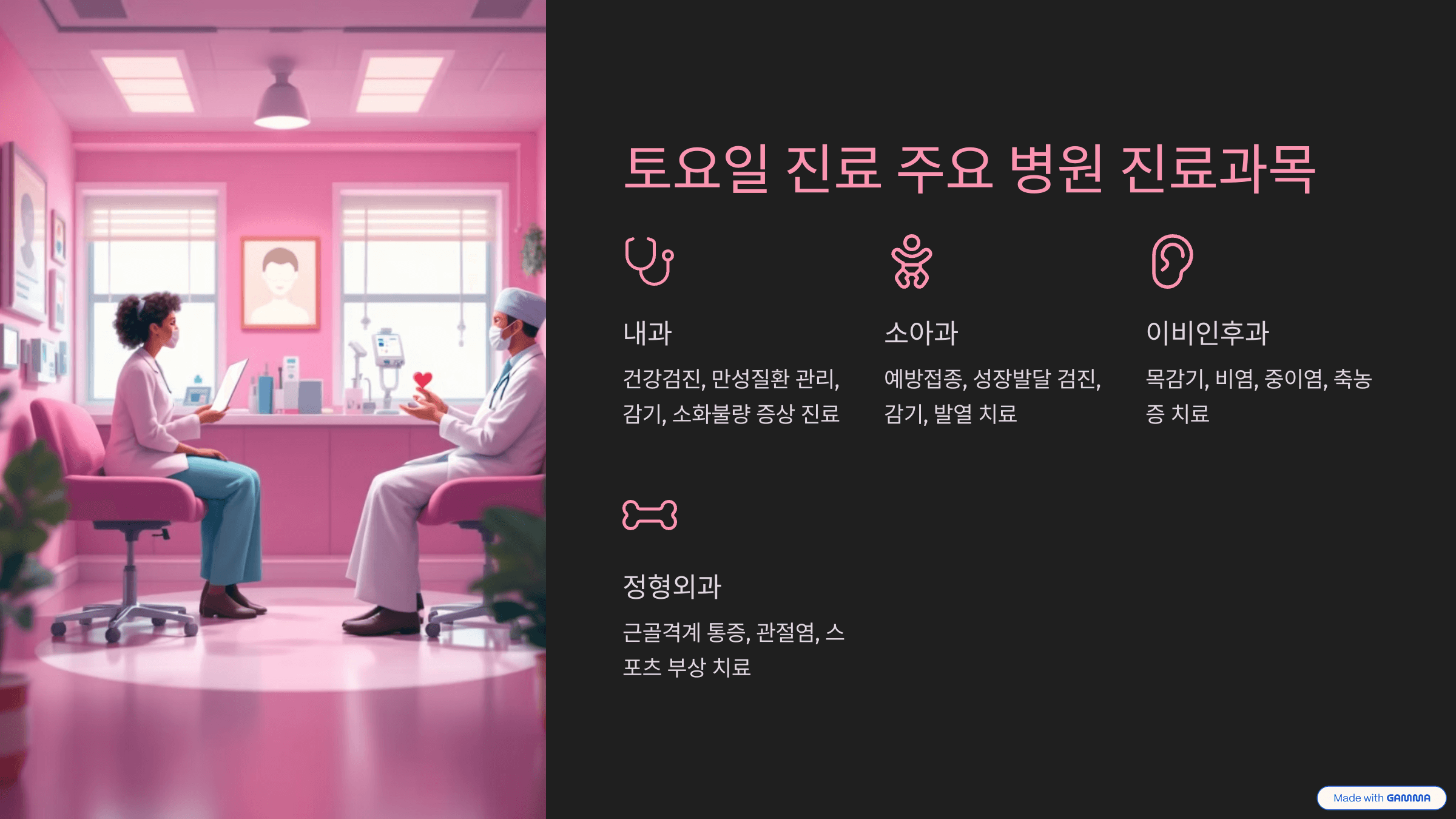 횡성군에서 토요일에 주로 찾게 되는 병원 진료과목은 내과, 소아과, 이비인후과, 정형외과가 대표적이며, 특히 평일에 시간을 내기 어려운 직장인들과 학생들이 많이 방문하는 곳입니다.