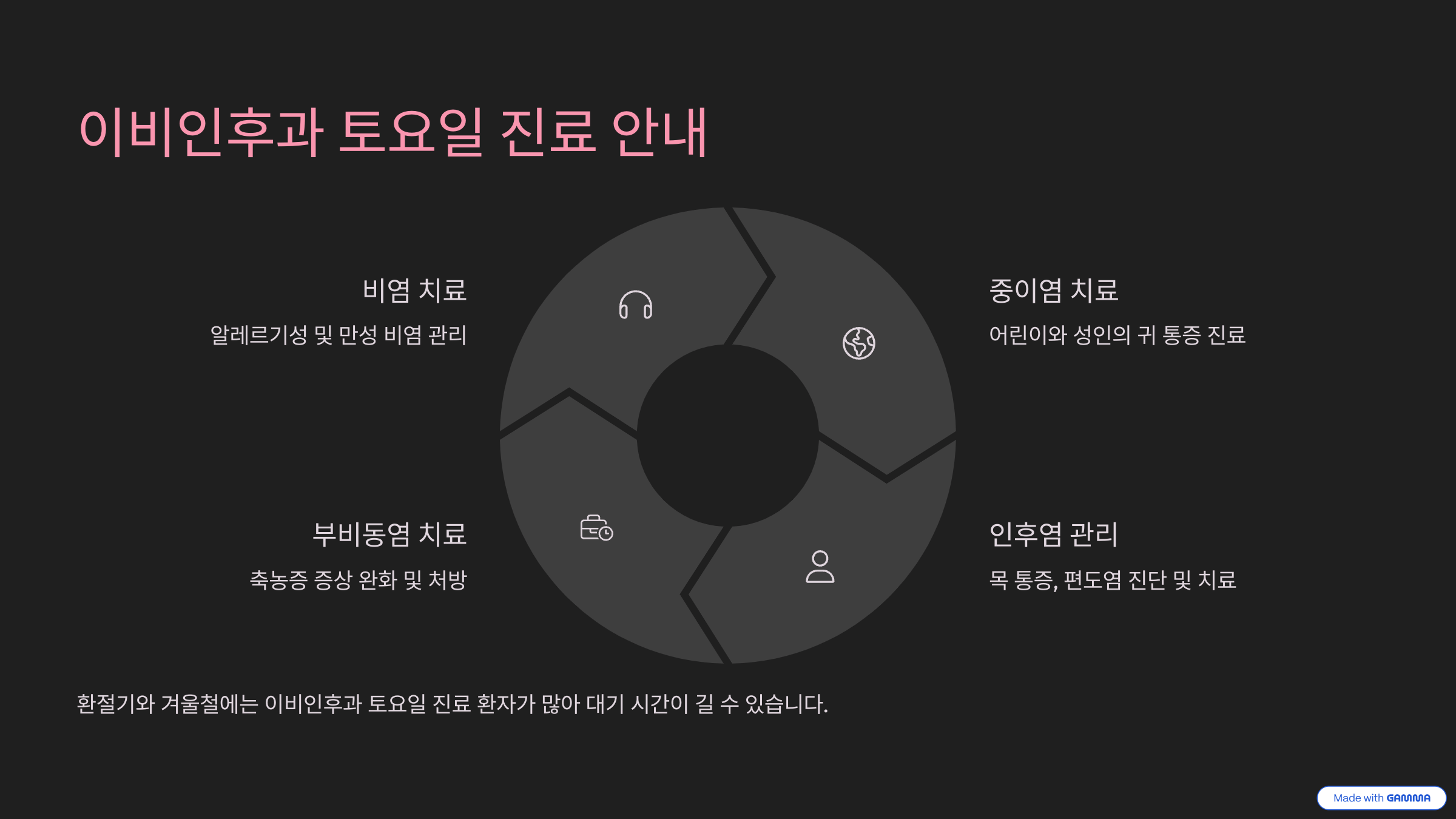 이비인후과는 목감기, 비염, 중이염, 축농증 등의 증상이 주된 방문 이유이며, 특히 환절기나 겨울철에 목과 코의 불편함으로 토요일 진료를 찾는 경우가 많습니다.